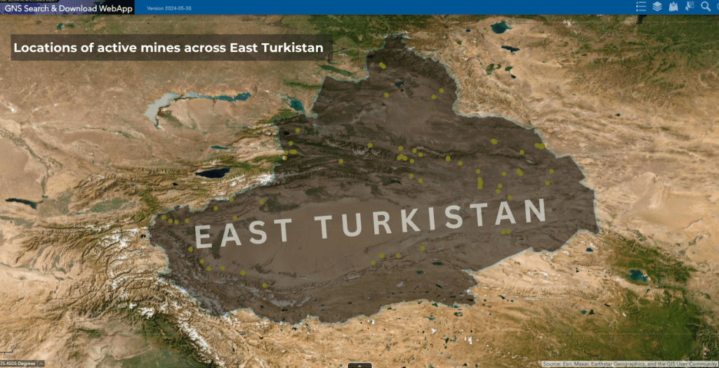 Locations of active mines across East Turkistan as of May 2024, source: National Geospatial Intelligence Agency