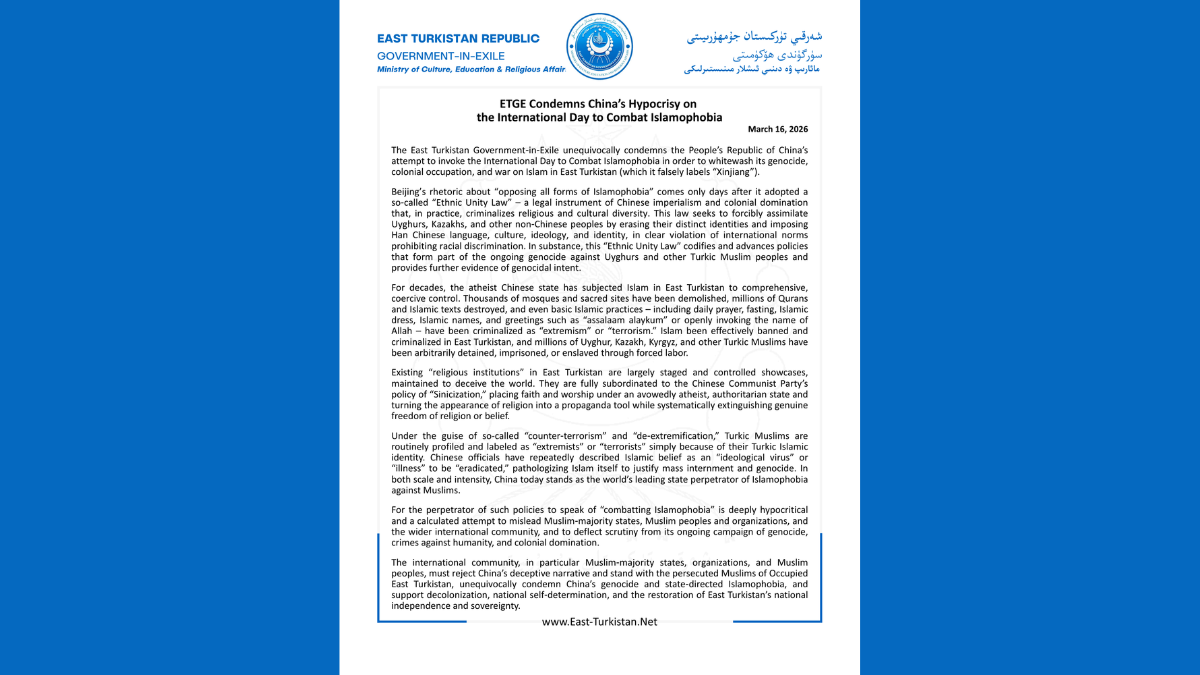 The East Turkistan Government‑in‑Exile unequivocally condemns the People’s Republic of China’s attempt to invoke the International Day to Combat Islamophobia in order to whitewash its genocide, colonial occupation, and war on Islam in East Turkistan (which it falsely labels “Xinjiang”).
