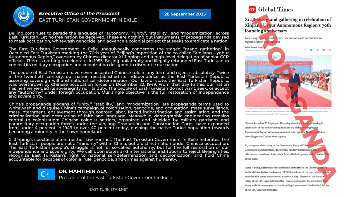 بېيجىڭنىڭ يالغانچىلىقىنى رەت قىلىپ، شەرقىي تۈركىستاننىڭ ئۆز تەقدىرىنى ئۆزى